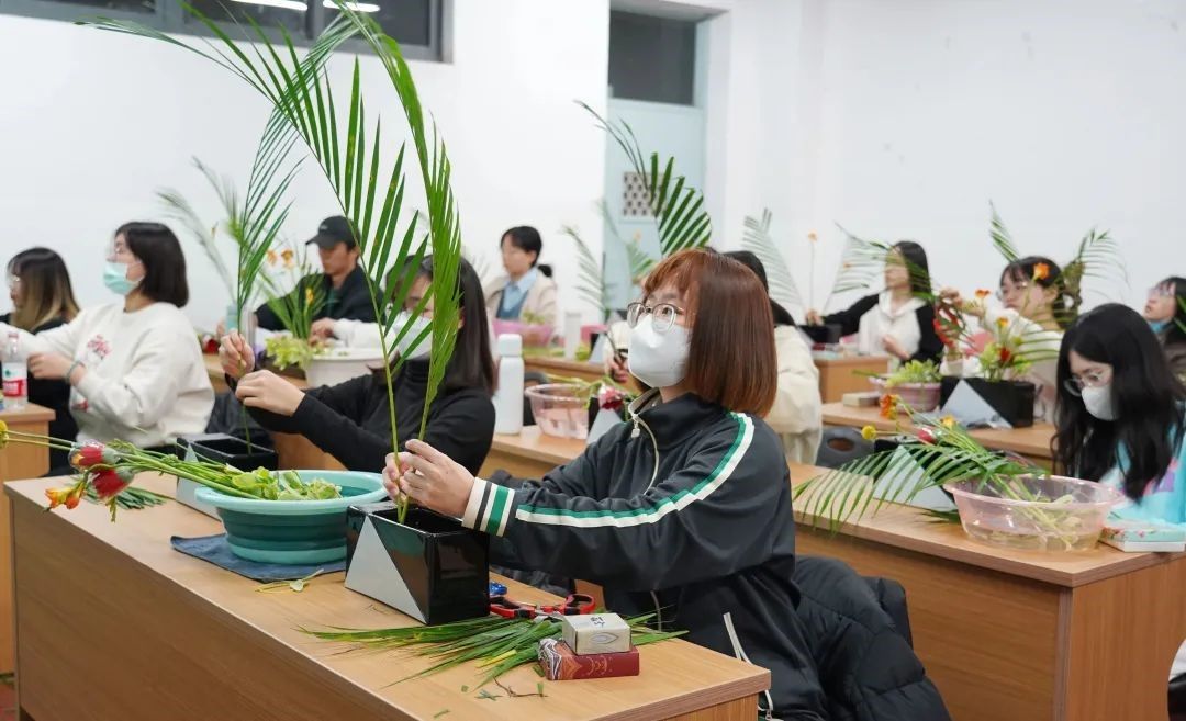 Robust and dynamic plum branches, cherry blossoms on the brink of blooming, vibrant tulips, and delicate, fresh daisies... Every Tuesday afternoon this semester, the area outside the Flower Arrangement and Creativity course classroom is brimming with an array of exquisite flowers, captivating the attention of passersby who pause in admiration.