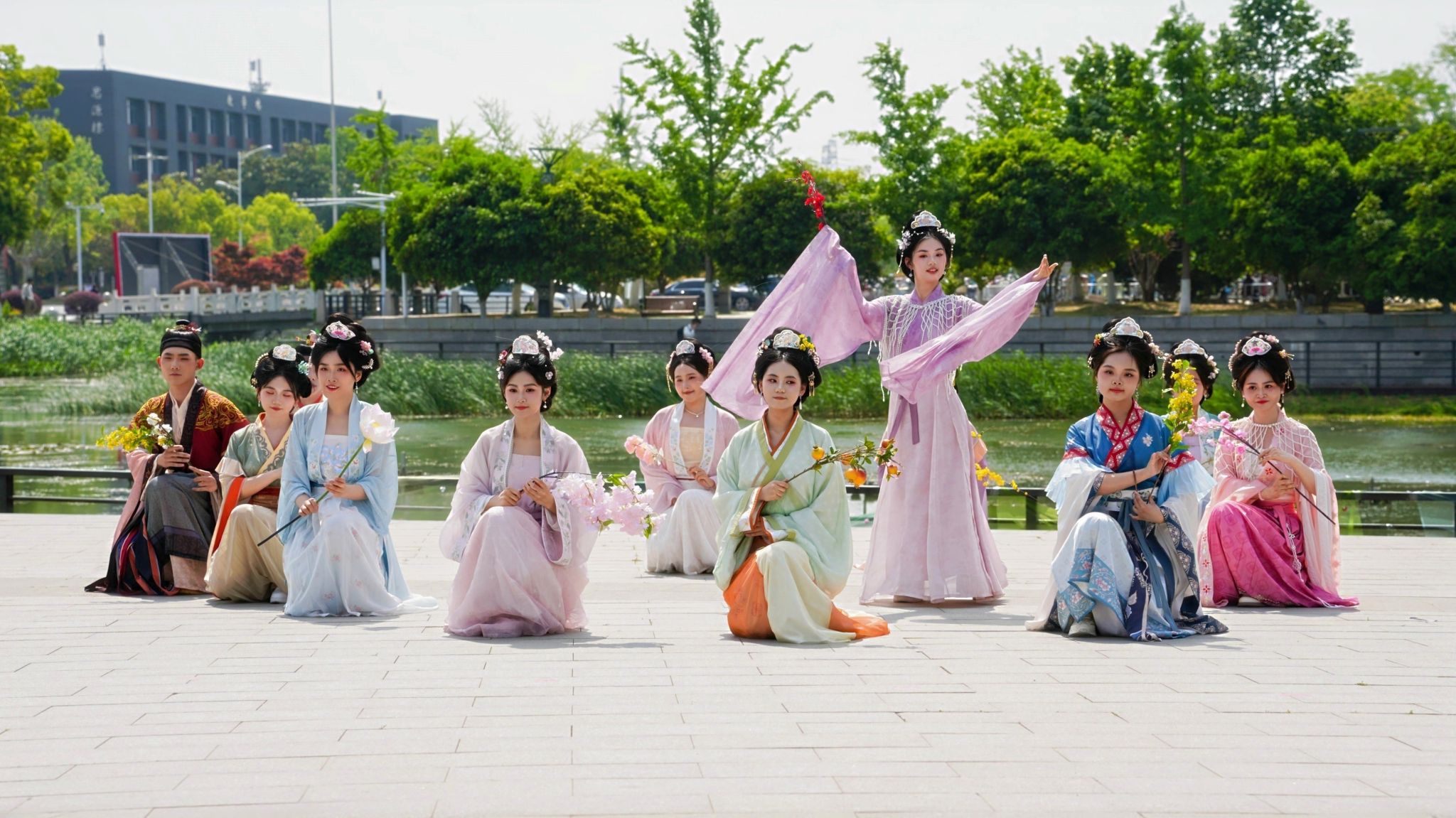 Suddenly, the pipa's delicate arpeggio and the sharp clash of cymbals cut through the crowd, announcing two NJU alumnae portraying Du Liniang and her maid Chunxiang from Tang Xianzu's Peony Pavilion. Their embroidered sleeves trailed whisper-soft behind them as they advanced in measured rhythm, lifting poised fingers to guide the audience's gaze. Twelve Flower Gods—each representing one of the traditional lunar months—entered in procession to complete the tableau.