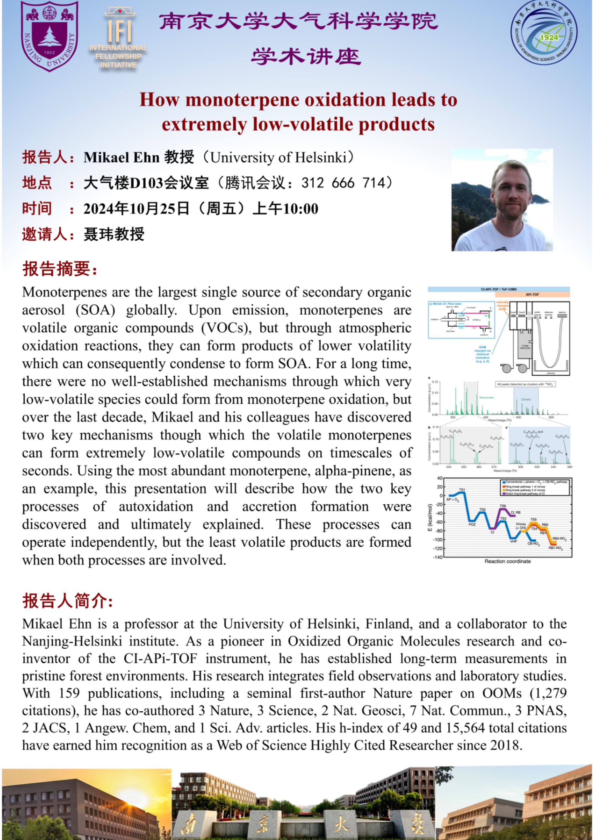Speaker: Mikael Ehn, Professor at the University of Helsinki, Finland, Collaborator to the Nanjing-Helsinki institute