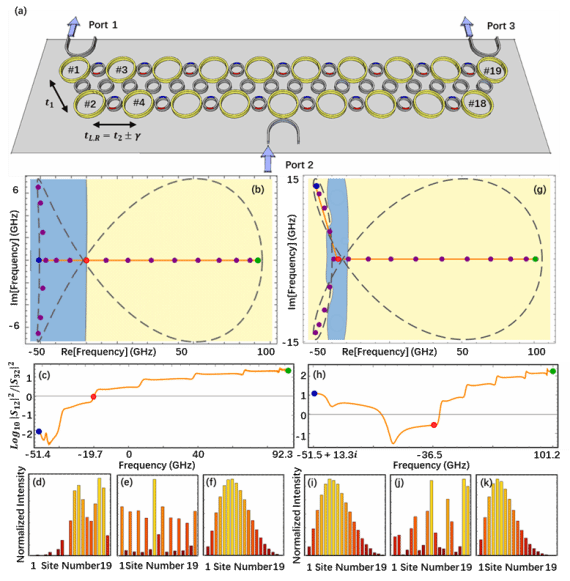 3. Schematic diagram of the resonant ring array realizing the skinning effect (a) Schematic diagram of the ring array system. (b,g) The complex frequency plane response of the system, blue and yellow corresponding to the skinning states of the left and right end pile-ups, respectively. (c,h) The transmittance ratio functions of ports 1 and 3 corresponding to the orange paths in Fig. (b,g). (d~f,i~k) The normalized light field energy distribution corresponding to the blue, red and green points in Fig. (b~c,g~h).