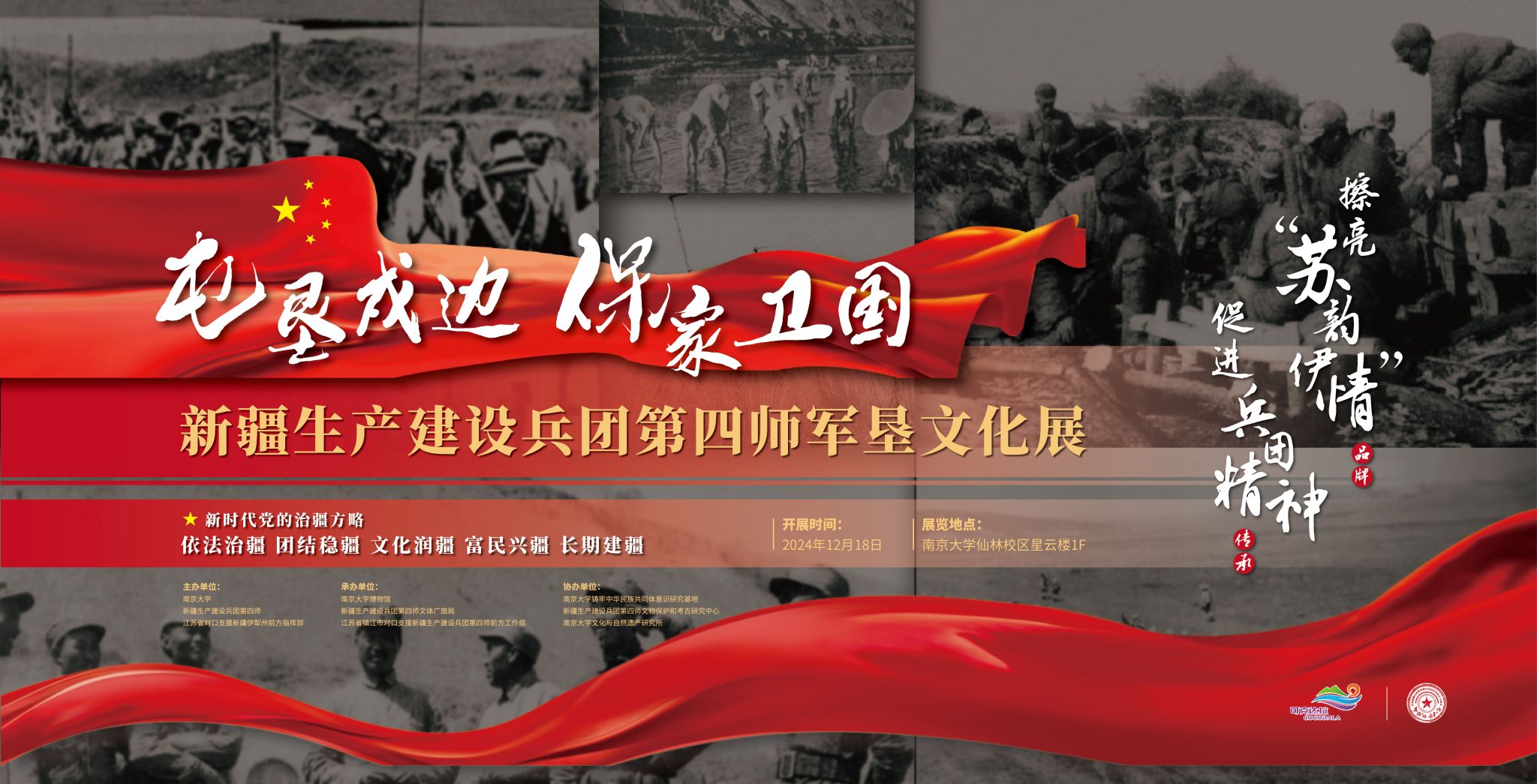 2024年是新疆生产建设兵团成立70周年,“屯垦戍边 保家卫国——新疆生产建设兵团第四师军垦文化展”旨在让广大师生更加深刻地了解兵团精神,充分感受兵团在开发建设新疆、增进民族团结、推进社会进步、巩固西北边防等方面作出的重要贡献,充分认识到兵团在推进中华民族共同体建设和建设美丽新疆、实现新疆工作总目标中发挥的重要作用,多元化开展苏伊交流活动,丰富苏韵伊情文化内涵。展览紧密围绕“铸牢中华民族共同体意识:从古代到现代”这一主题,从新疆兵团成立发展史、近代屯垦史、第四师革命战斗史、第四师戍边建城史等多个方面集中展示了中华民族屯垦戍边精神的传承。展览通过丰富的实物展示、图文展板,全方位、多角度地展现了新疆生产建设兵团第四师历代屯垦戍边的壮丽篇章、多元文化的深度融合以及兵团城市建设与戍边防护的辉煌成就。这是新疆生产建设兵团专题展第一次走出新疆、走入高校,也是江苏援疆首次成果汇报展。