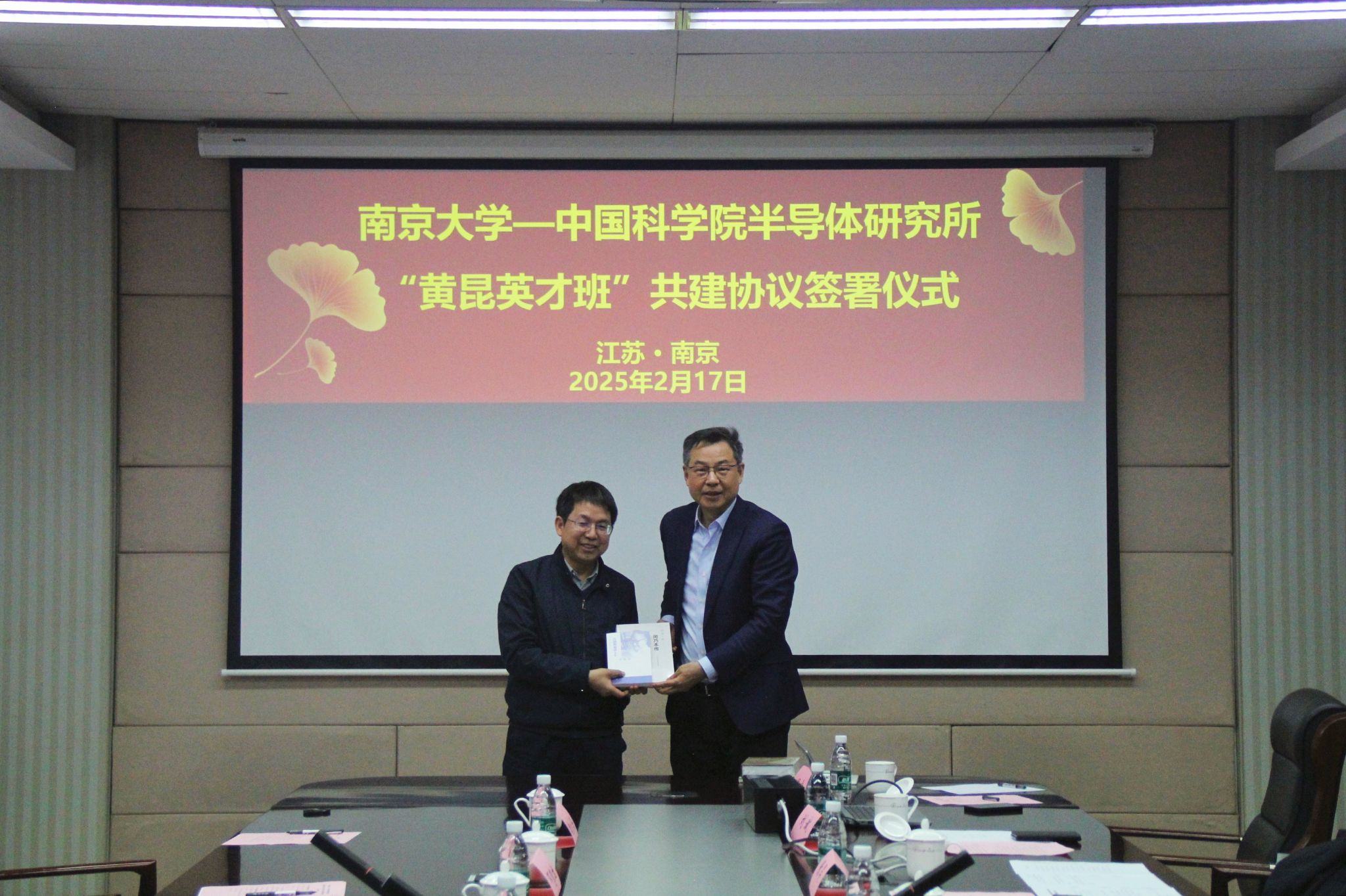 在热烈的掌声中,谭平恒和我校电子科学与工程学院院长刘斌作为双方单位代表,签署合作协议与“黄昆英才班”共建协议,并合影留念。随后,双方互赠书籍,分别是中国科学院半导体研究所黄昆先生文集,以及记录凯发k8官网冯端先生、闵乃本先生学术生涯与人生轨迹的传记书籍,致敬双方杰出科学家的学术成就,加强双方在立德树人与学术文化传承方面的交流。