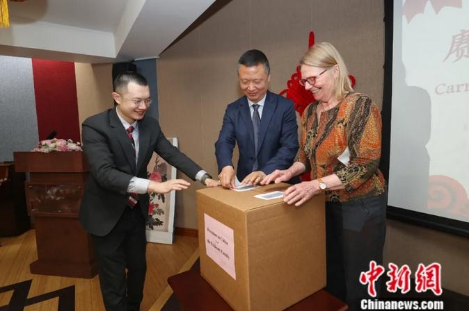 当地时间2025年7月6日,中国驻加拿大多伦多总领馆,总领事罗伟东(中)与已故加拿大友人、国际著名和平人士文幼章(James G. Endicott)的孙女文美兰(Marion Endicott)共同为文家捐赠并将启运中国的文幼章对华交往史料物品封箱。抗日战争期间,文幼章曾对中国给予宝贵援助与支持。中新社记者 余瑞冬 摄