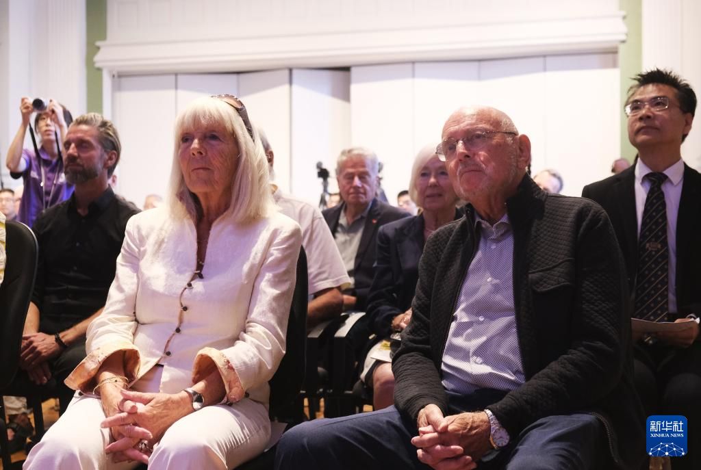 8月21日,在丹麦首都哥本哈根,辛德贝格基金会主席、辛德贝格的外甥女玛丽安·安德森(前左)和辛德贝格同父异母的弟弟奥勒·辛德贝格(前右)参加展览开幕式。新华社记者 张玉亮 摄