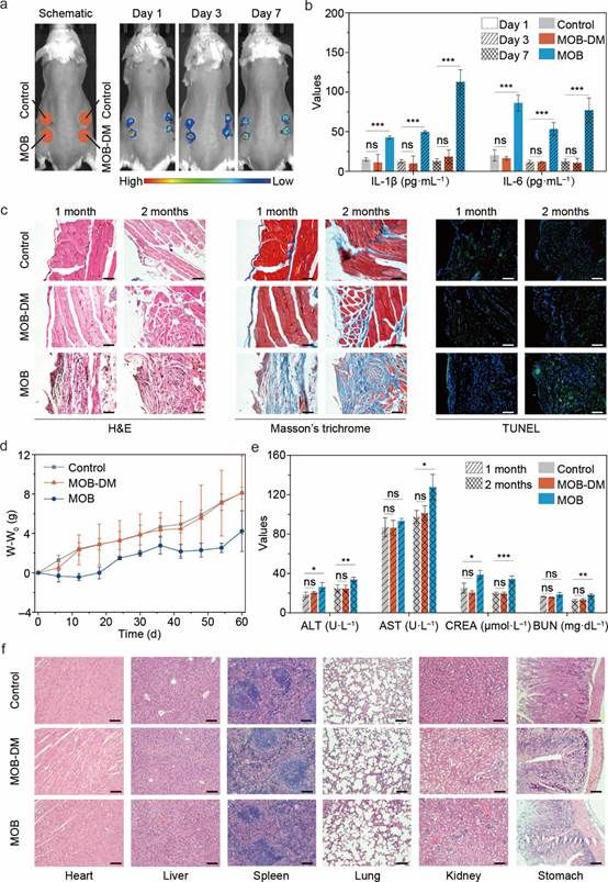 此外,该工作详细研究了镁氧气生物电池的生物安全性。通过双层膜的设计,实验组血清中的镁离子浓度变化与未植入电池的空白对照组无统计学差异。此外,采用多种与缺氧相关的生化指标,包括乳酸脱氢酶(LDH),超氧化物歧化酶(SOD)和丙二醛(MDA),评估了氧气的消耗情况。结果表明实验组与对照组相比没有统计学差异。其次,通过组织学研究的方法,评估了镁氧气电池植入部位周围组织的炎症反应情况。结果显示小鼠植入部位周围组织与对照组相似。这些结果表明,镁氧气电池植入后,与组织之间形成良好界面,具有较好的生物相容性,没有引起异常或慢性免疫反应,具有较好的生物安全性。