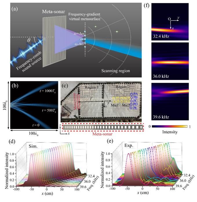 图1. (a)无源静态超构声呐的工作原理图;(b)超构声呐在不同时刻产生的空间声束;(c)实验系统和超构声呐器件的实拍图;(d-f)入射梳状谱声源中不同频率分量的空间分离结果。