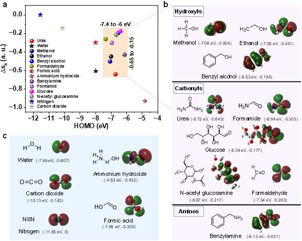 图5. 三价镍电氧化有机物的通用性。(a)以亲核原子?sk和小分子的HOMO能级作为描述符,筛选Ni3+有效氧化的有机物。(b)可被Ni3+氧化的有机物HOMO能级和结构式。(c)不可被Ni3+氧化的有机物的HOMO能级和结构式。