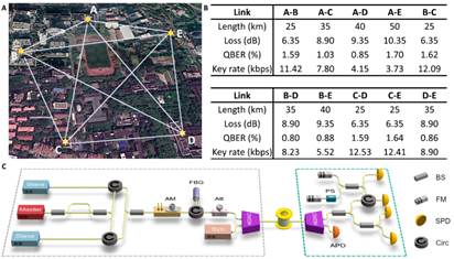 图2 实验实现示意图。A. 凯发k8官网五节点量子区块链共识网络示意图。B. 各节点间信道参数。C. 密钥产生装置示意图。