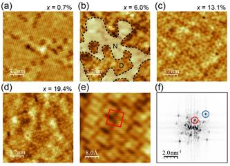 图2:单层FeSe/STO形貌演化。(a) 随机分布的铁空位的形貌图。(b) 两个区域中不同铁空位数量的形貌图。(c)局部铁空位有序的形貌图。(d)低温退火后具有长程相干铁空位序的形貌图。(e)
