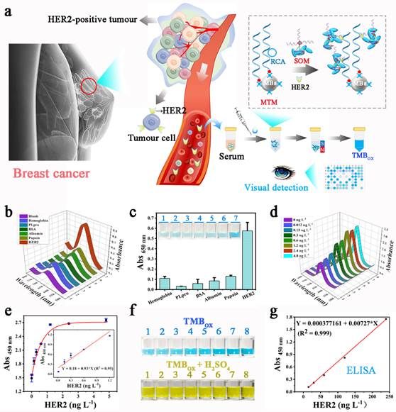 随后,基于TDN控制的MOFs自组装现象,研究团队研制了一个可视化生物传感器用于HER2阳性乳腺癌的诊断(图3)。该生物传感器主要包括两个模块:磁珠捕获模块(MTM)和基于TDN诱导MOFs组装的信号输出模块(SOM)。MTM通过生物素-亲和素作用将生物素修饰的DNA适配体与链霉亲和素修饰的MBs连接而构成。根据设计,靶标(HER2)首先被滚环扩增(RCA)后的多价DNA适配体功能化的MBs (MBs-mApt)捕获和分离。然后MOFs-TDN-apt识别并结合MBs捕获的HER2。最后,利用具有纳米酶活性的MOFs材料PCN - 222 (Fe)催化3,3 ',5,5 ' -四甲基联苯胺(TMB)发生氧化还原反应生成蓝色氧化态,通过MBs表面自组装MOFs与RCA的双重信号放大手段实现对靶标的高灵敏检测。