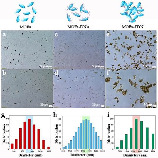 研究团队首先详细地探究了四面体DNA(TDN)诱导MOFs发生自组装的过程以及影响自组装程度的关键因素。TDN修饰到MOFs纳米材料表面的原理主要是通过TDN顶点修饰的磷酸基团与MOFs纳米材料表面的锆离子间的配位相互作用。研究发现,单链DNA修饰的MOFs并不能诱导MOFs发生自组装,而TDN却能剧烈地诱导MOFs发生自组装(图2)。实验结果显示,TDN顶点上含有的游离磷酸基团越多,MOFs自组装的程度则越高,而且,TDN的浓度对MOFs的组装具有关键性作用,过高或者过低浓度的四面体DNA都不利于MOFs的自组装。