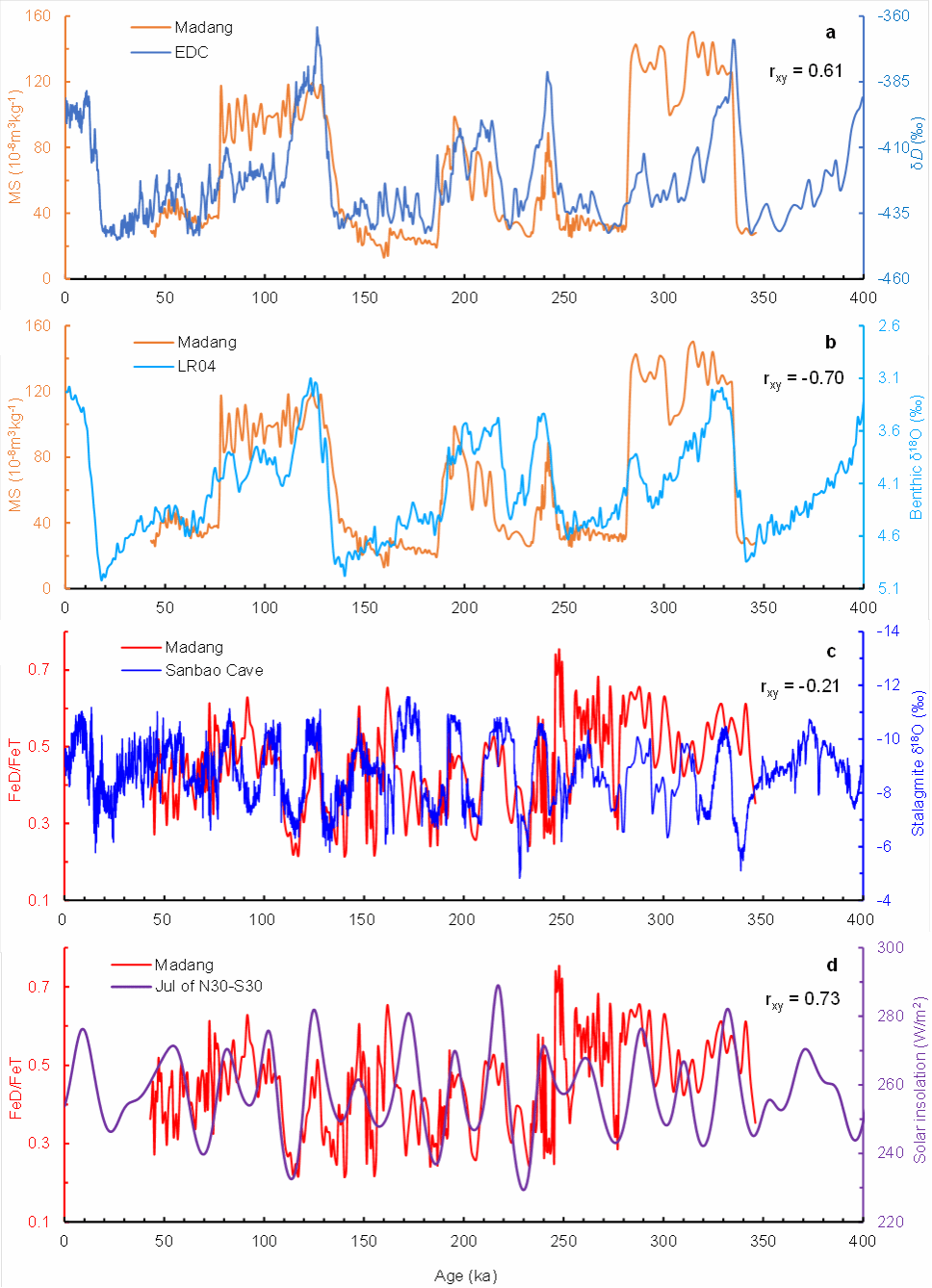 磁化率通常指示成壤强度,一般受降水与温度的共同影响。如果马垱剖面的磁化率主要是降水的代用指标,则需要引入起到信号平滑作用的沉积后过程解释,通过其消除2万年的周期。更加可能的解释是,马垱剖面的黄土磁化率主要反映了温度的变化,其与南极温度记录呈明显的正相关(图3)。推测是温度升高有利于蒸散发作用,从而降低了土壤湿度,避免黄土发生还原而导致磁化率降低。