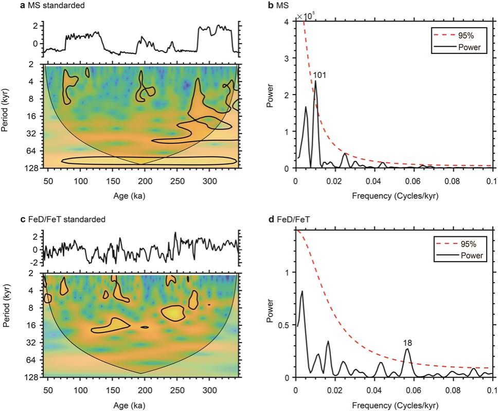 图2 马垱剖面的磁化率指标(a, b)与FeD/FeT指标(c, d)的小波与频谱分析结果