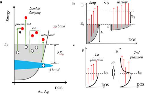 图2 (a) 贵金属(金,银)中四种热电子产生机制示意图。(b)通过降低sp能带的深度促进热电子生成。(c)通过连续激发相同的等离激元来促进热电子生成
