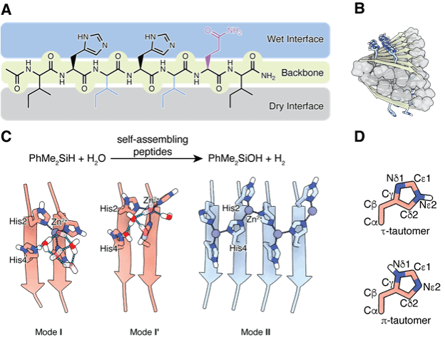 近日,该课题组发表论文,首次报道了基于理性设计的功能性多肽自组装体在室温条件下催化硅烷水解产生氢气的研究工作。借助多尺度理论计算,研究团队预测了一类具有两亲性的七肽能自组装形成纤维结构,并有效催化二甲基苯基硅烷等一系列硅烷的水解反应。后续的湿实验中,通过气相色谱法定量检测氢气生成,实验证实了理论预测的准确性,从而显著扩展了功能性自组装多肽在催化反应中的应用。此外,结合分子动力学模拟与多种实验表征手段,如原子力显微镜、圆二色谱和固态核磁共振,研究人员揭示了多肽序列调控自组装结构和催化功能的能力,以及催化中心的双重模式,进一步建立了功能性多肽自组装体系的构效关系。