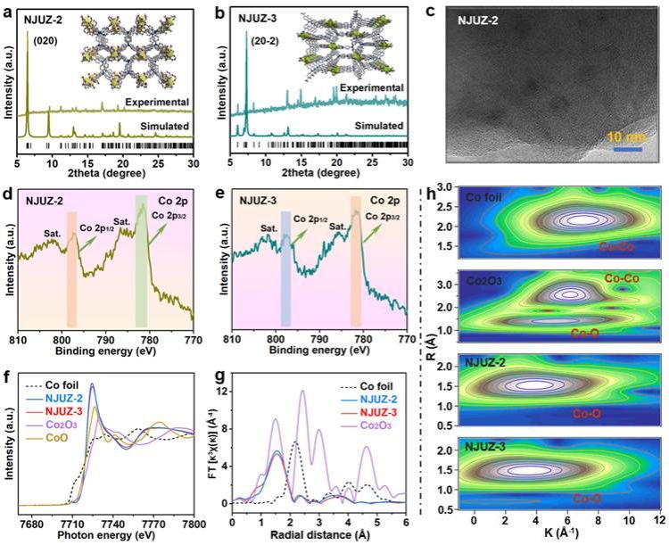 我们通过溶剂热反应过程合成了两种不同的多核钴团簇基配位聚合物,{[Co2(TCPPDA)(H2O)5]·(H2O)9(DMF)}和{Co1.5(TCPPDA)[(CH32NH2]·(H2O)6(DMF)2},分别表示为NJUZ-2和NJUZ-3 (图1)。如图2(a-b)所示,合成的钴基配位聚合物(CP)的PXRD图中的衍射峰显示了NJUZ-2的(020)晶面和NJUZ-3的(20-2)晶面的择优取向,展示了钴基CP的结构特征。高分辨率XPS光谱在781.5 eV和797.3 eV处的特征峰,分别对应于Co2+物种的2p3/2和2p1/2带(图2(d-e))。此外,可以在大约785.6 eV和801.7 eV处观察到卫星峰的存在。为了研究样品的局部配位和电子结构,我们测试了Co K边缘的X射线吸收精细结构(XAFS)数据。NJUZ-2和NJUZ-3样品的吸收边靠近CoO的位置,表明其氧化态相似(图2f)。此外,两条曲线中都没有明显的前边缘峰,这表明钴原子处于八面体配位环境。NJUZ-2和NJUZ-3的R空间图显示,在1.55?处有一个突出的峰值,这与Co-O配位的特征有关(图2g)。为了进一步阐明配位原子,采用了Co K边小波变换,表明样品的K位置与Co2O3接近,这也证明了Co-O配位的特征(图2h)。