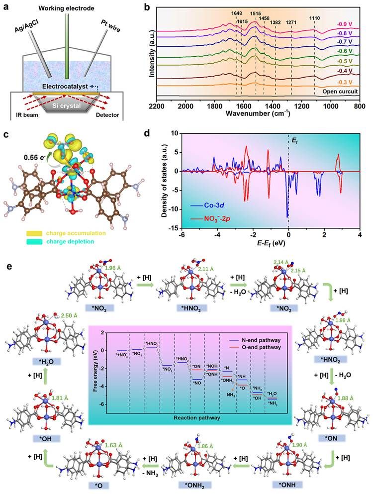 为了深入了解NITRR过程中的内在电催化机理,我们进行了原位ATR-FTIR光谱分析(图4a)。图4b显示了NJUZ-2的原位ATR-FTIR结果,其中施加的过电势范围为-0.3至-0.9 V(相对于RHE)。如图4e所示,使用密度泛函理论(DFT)计算了NJUZ-2模型可能的NITRR途径中的吉布斯自由能差。NITRR过程的初始步骤涉及NO3-的吸附,在整个反应过程中起着至关重要的作用。图4c中观察到的从Co原子到NO3-部分的电荷转移(0.55e-)进一步表明,金属Co原子可能是NITRR过程的活性位点。如图4d所示,PDOS结果表明Co-3d轨道位于费米能级(Ef)附近,也表明催化性能增强的活性位点。而这些轨道之间的显著重叠确保了NO3-在后续电还原反应中的稳定吸附。