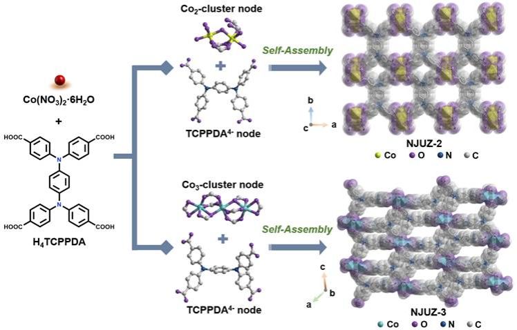 凯发k8官网化学化工学院金钟、马晶、苏剑等人密切合作,在这项研究中报告了两种基于钴团簇的多核配位聚合物{[Co2(TCPPDA)(H2O)5]·(H2O)9(DMF)}和{Co1.5(TCPPDA)[(CH32NH2]·(H2O)6(DMF)2}(命名为NJUZ-2和NJUZ-3)的设计和合成,它们具有不同的配位环境,明确的孔隙率、高密度催化位点、有效的传质通道和纳米限域的化学环境。得益于其独特的多核金属有机配位框架结构,NJUZ-2和NJUZ-3对电催化硝酸根还原(NITRR)表现出优异的催化活性。进一步的实验分析结合理论计算表明NITRR活性的显著增强归因于NO3-在催化剂表面的优先吸附和*NO3和*NO2中间体加氢所需的能量输入的降低。