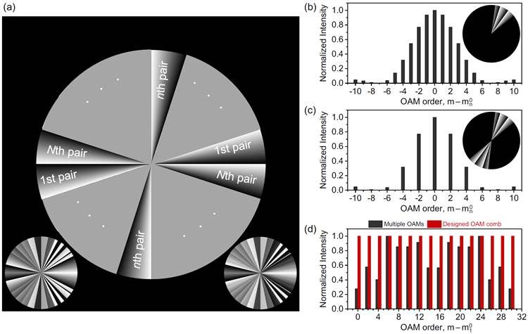 为此,研究人员首先提出并证实了一种以期最小复杂性实现动态、可控切换的按需数字多模OAM梳的策略:具有二重对称性的多涡旋相位图设计方案(如图1所示)。在该设计中,仅需调控相位图中每个扇形涡旋的初始相位,即可按需生成包含OAM梳在内的任意OAM谱。基于上述设计策略,利用空间光调制器(SLM)等纯相位调制元件即可便捷地实现从基模高斯光到携带多模OAM光的高效转换。该纯相位调制方式的高效性为实现多模OAM(尤其是OAM梳)数字激光器奠定了基础。