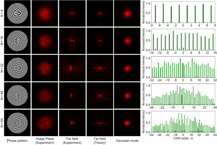 其次,研究人员提出了一种新颖的嵌套环形腔结构,如图2(a)所示:在该“8”字环形腔中,有一对加载共轭多涡旋相位图的SLM和一个嵌入的4f系统构成的简并腔;其中虚线框所示的部分可以等效为一个腔镜M12,这样“8”字形的环形腔简化为一个由M12、M3和M4构成的稳定三镜环形腔,如图2(b)所示。一个稳定谐振腔通常将以高斯模式振荡,因此在M4-M1路径中振荡的高斯模式由SLM1被转化为携带有预设相位的结构激光模式,然后经4f系统成像在携带共轭预设相位的SLM2上,最后在M2-M3路径中被再次恢复到高斯模式。由于嵌入的简并腔可以支持任意相位编码模式,突破了常规稳定环形腔的横模限制;另一方面, 在“8”字环形腔的其它路径上仍然以基模高斯振荡,相比于高阶模式激光,具有很高的稳定性。当在简并腔中插入一个偏振分束器,便可从腔中提取预设的结构激光模式输出。这一新颖激光器设计,既克服了简并腔空间相干性较差的问题,又解决了非简并腔模式竞争的问题,结合可编程的空间光调制器,实现了灵活、高相干性、可任意相位编码的空间结构光数字激光器。如图3所示,研究人员利用该激光器输出了高达64梳齿数的OAM梳激光。