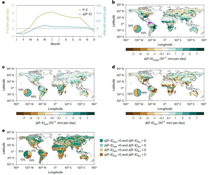大气科学学院葛骏助理教授和凯发k8官网信息工程大学魏江峰教授结合卫星遥感资料和水汽示踪数据,分析了P-E及全球植树造林对P-E影响的季节和空间变化。季节维度的分析表明,植树造林导致全球66%的地区湿季(P-E最大的季节)的P-E增大,54%的地区干季(P-E最小的季节)的P-E减小,从而导致64%的地区P-E的季节性增强,即湿季更湿、干季更干(图1)。此外,湿季P-E增大的情况在湿润区更为普遍(72%),而干季P-E减小的情况在干旱区更为普遍(63%)。