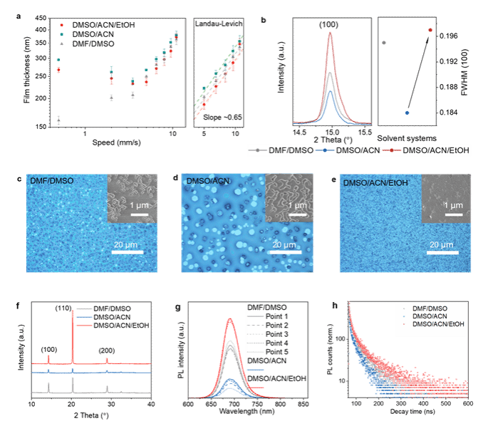 图2. 刮涂钙钛矿薄膜的结晶动力学和薄膜性质。(a)不同溶剂的Landau-Levich曲线;(b-e)不同溶剂对应的钙钛矿薄膜的结晶动力学;(f-h)薄膜性质表征。