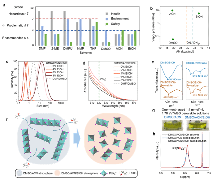 图1. 钙钛矿前驱体溶液的作用力和胶体性质。(a)不同常用溶剂的危害程度示意图;(b-f)乙醇与铅卤化合物的作用力表征及其对应的胶体性质变化;(g-h)乙醇防止溶液降解的表征。