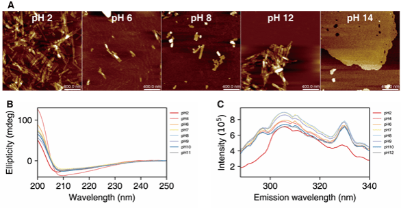 研究人员通过圆二色谱表征,证实IIQ序列在不同pH条件下均可维持其β折叠片自组装结构。与此同时,原子力显微镜等显微技术揭示了自组装结构在不同pH环境中存在显著的形态学差异;这些形态变化与多肽链的局部电荷分布及与环境的相互作用密切相关。模拟预测结果与实验验证数据的高度一致性,充分说明计算驱动方法在研究多肽自组装体结构与功能关系方面的有效性,也从原子层面揭示了pH变化如何精细调控多肽的自组装过程及其最终结构形态。
