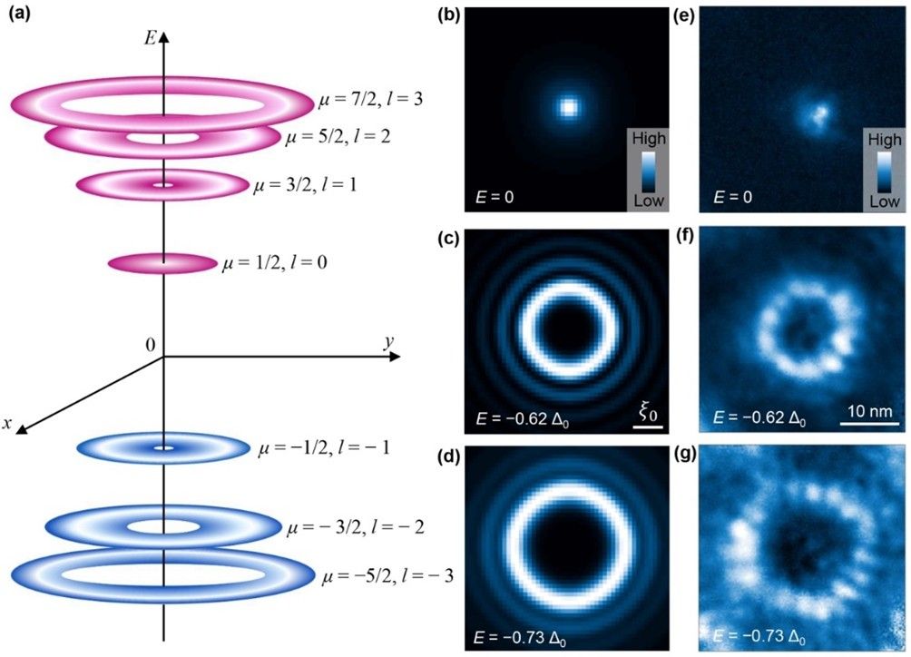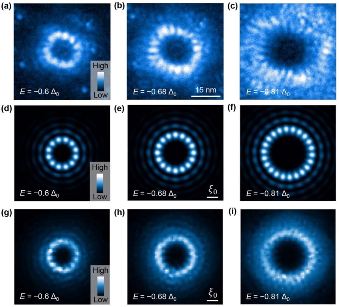 图1a展示了理论预期的磁通束缚态能级示意图,具有相反角动量(±l)的束缚态波函数在空间上重合,当杂质引起束缚态之间散射时,它们之间的干涉会起到重要的作用。相反的角动量意味着这两个态可以看作是两个反向的行波,其干涉就会产生驻波,出现沿着环向的振荡。图2d-f展示了二能级近似(只考虑±l 能级耦合)下的计算结果,很好地再现了实验中观察到的环向态密度振荡。严格对角化的计算结果如图2g-i所示,计算得到的磁通半径和振荡次数定量与实验结果相符。