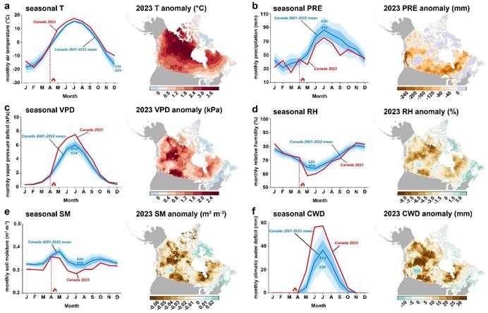 图2 2023年加拿大的极端高温和干旱条件。因子包括气温(T)、降水(PRE)、饱和水汽压差(VPD)、相对湿度(RH)、表层土壤水(SM)和气候水分亏缺(CWD)。