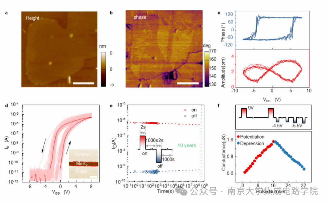 在器件应用方面,该工作展示了3R-MoS?的滑移铁电性能(图3)。实验利用压电响应力显微镜(PFM)清晰观测到材料中的铁电畴结构及明显的压电响应回滞曲线,并构建了基于双层3R-MoS?沟道的超薄铁电晶体管阵列。器件在转移特性曲线中呈现明显的逆时针回滞行为,进一步印证其非易失铁电调控能力。尽管沟道材料厚度仅为1.3 nm,其仍表现出超过十年的数据保持能力、优异的电导特性以及16位多态写入能力,为未来高密度、低功耗、非易失存储器件的三维异质集成提供了可能。