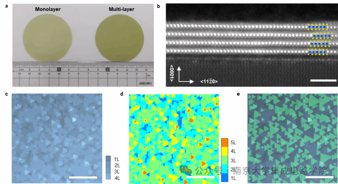 为攻克这一难题,研究团队使用同质外延策略,采用高质量单层单晶MoS?作为外延衬底,通过精准调控过渡金属前驱体浓度,成功实现了具有纯3R相的多层MoS?晶圆的制备(图1)。借助人工智能图像识别技术,对堆垛结构进行自动化识别与统计分析,证实3R相占比接近100%。从微观到宏观尺度,通过截面和平面扫描透射电子显微镜(STEM)、超低频拉曼光谱和二次谐波产生(SHG)等多手段对制备的多层MoS?进行堆垛表征,全面验证了所制材料的3R相一致性。