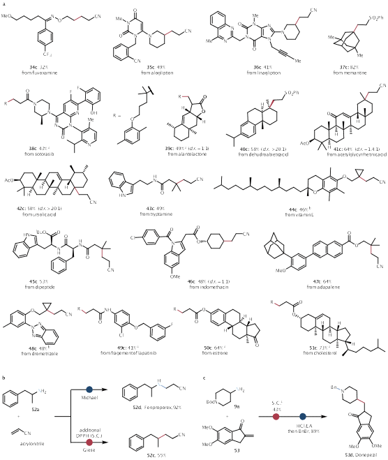 与此同时,该策略也被应用于药物末端编辑中。如Fluvoxamine、Alogliptin、Linagliptin等上市药物通过该方法实现结构转化,保留核心结构同时拓展结构空间。团队还以Donepezil为例,从商品胺出发,三步完成药物合成,展示了该方法在快速构建药物候选分子方面的潜力。