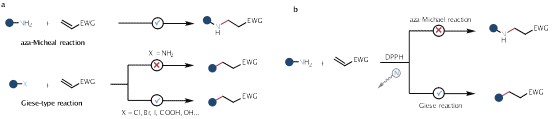 伯胺是最常见且最廉价的有机砌块之一,广泛存在于天然产物、药物和生物探针分子中,尤其在医药化学中具有不可替代的重要性。虽然胺基广泛用于亲核反应,如aza-Michael加成,但其作为“烷基源”构建(sp?)C?C(sp?)键却面临挑战(图1a)。在此基础上,该团队提出“脱胺Giese反应”新思路(图1b):在aza-Michael反应体系中引入O-二苯基磷酰基羟胺(DPPH),利用其高效的氮删除能力,抑制传统C?N加成路径,从而引导反应走向C?C键构建。其价值体现在以下几个方面:(1)方法学上扭转传统氮杂Michael加成反应体系。无需购买任何新原材料即可获得替代产品,实现构建C?N键到构建C?C键的转化;(2)使用市售试剂O-二苯基膦基羟胺(DPPH)作为脱氮剂,仅需10分钟即可完成转化,具备优异的官能团兼容性与广泛的底物适应性;(3)该方法统一了Giese反应和氮杂Michael加成的反应前体池,为药物发现提供了高效的分子修饰工具。
