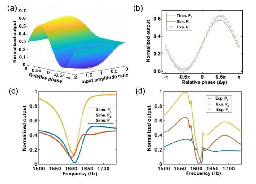 基于此,研究团队首次在实验中成功观测到奇异点处声相干完美吸收现象。如图3(b)和(c)所示,在奇异点对应的特征频率处,透射率和反射率均趋近于零,即能够实现完全吸收(吸声系数>90%),且实验、理论和数值仿真结果高度吻合,证实了所提出的非厄米调控机制的有效性。为满足实际应用需求,本工作还进一步系统探究了该奇异点在相干声场调控中所表现出的优异特性。如图4所示,该非厄米散射系统在奇异点附近具有对入射波相位变化的超高灵敏度,同时能够显著拓展吸声带宽。上述研究成果为开发高灵敏声学传感和宽带波前操控器件提供了新思路,未来有望在噪声控制、无损检测和声通信等领域发挥重要作用。此外,该机制还具有普适性,可推广至光学等其他经典波体系,为深入探索非厄米奇异点物理领域提供了通用的研究范式。