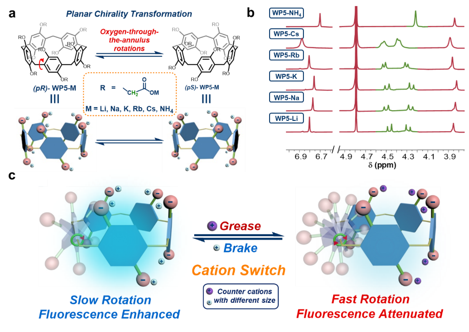 近期,强琚莉、林晨课题组与马晶教授课题组合作报道了一类通过抗衡阳离子调控的基于阴离子型柱芳烃(WP5-M)骨架构筑的分子转子平台,成功实现了对柱芳烃中芳环旋转运动的精确调控,通过对于柱芳烃芳环基元微观运动的调控,构建了新型荧光开关,并拓展了其在防伪墨水方面的应用。