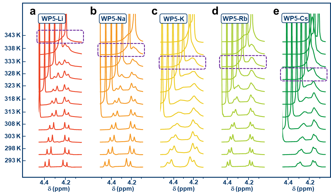 在充分探究了阳离子对WP5旋转能垒的影响后,作者通过阳离子切换,对WP5转子的旋转速度进行调控。在WP5-Li的核磁谱图(298 K,D2O)中柱芳烃侧链亚甲基的氢裂分成两个二重峰,这表明WP5转子缓慢转动;向体系中加入氟化铵,沉淀除去锂离子,并引入润滑剂铵离子,WP5的转动加快,WP5侧链亚甲基氢的核磁信号变成单峰;继续向体系中加入氢氧化锂,同时鼓入氮气以除去润滑剂铵离子,甲基的氢又恢复双峰,转子的旋转速度被抑制。该调控可以进行多次循环。
