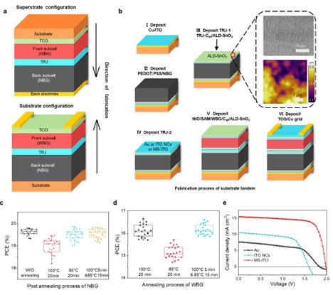 图1 “衬底型”全钙钛矿叠层器件。a, 顶衬型和衬底型的全钙钛矿叠层器件结构示意图。 b, 衬底型全钙钛矿叠层器件的制备过程。 c, 窄带隙钙钛矿器件进行后退火的性能变化。 d, 不同退火温度下宽带隙钙钛矿器件性能变化。 e, 采用不同隧穿复合结的衬底型全钙钛矿叠层器件的J-V曲线。