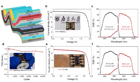 图5. 柔性衬底型全钙钛矿叠层器件 a, 柔性衬底型全钙钛矿叠层结构示意图。b,c,d 使用PEN衬底的柔性衬底型全钙钛矿叠层器件的JV、EQE和弯曲测试稳定性。e, f 使用铜箔衬底的柔性衬底型全钙钛矿叠层器件的JV和EQE。