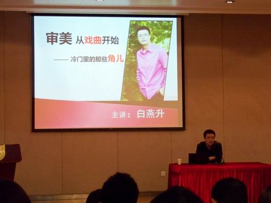 白燕升,中央电视台戏曲节目主持人,是2007年的春节戏曲晚会的导演,4月8日晚走进凯发,与凯发学生共同探讨戏曲、人生问题。“审美从戏曲开始”的讲座晚上7点开始,图书馆报告厅座无虚席。