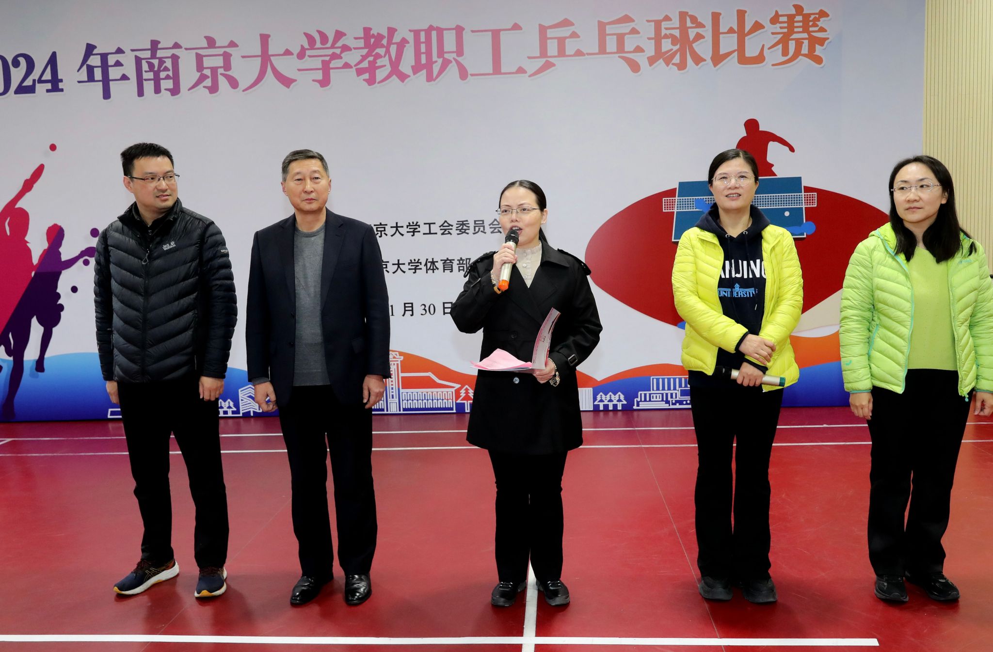 11月30日,由校工会主办、体育部承办的2024年凯发k8官网教职工乒乓球比赛在仙林校区方肇周体育馆举行。来自25支代表队的240余名教职工参加比赛。校工会主席唐少秋主持开幕式并为获奖队伍颁奖。体育部主任殷飞、校工会副主席庄菁、体育部副主任、校工会兼职副主席罗刚等出席开幕式。体育部国际级裁判禹雪璐担任本次比赛总裁判长。文学院教授、校教职工乒乓球协会副会长周欣展代表运动员宣誓。