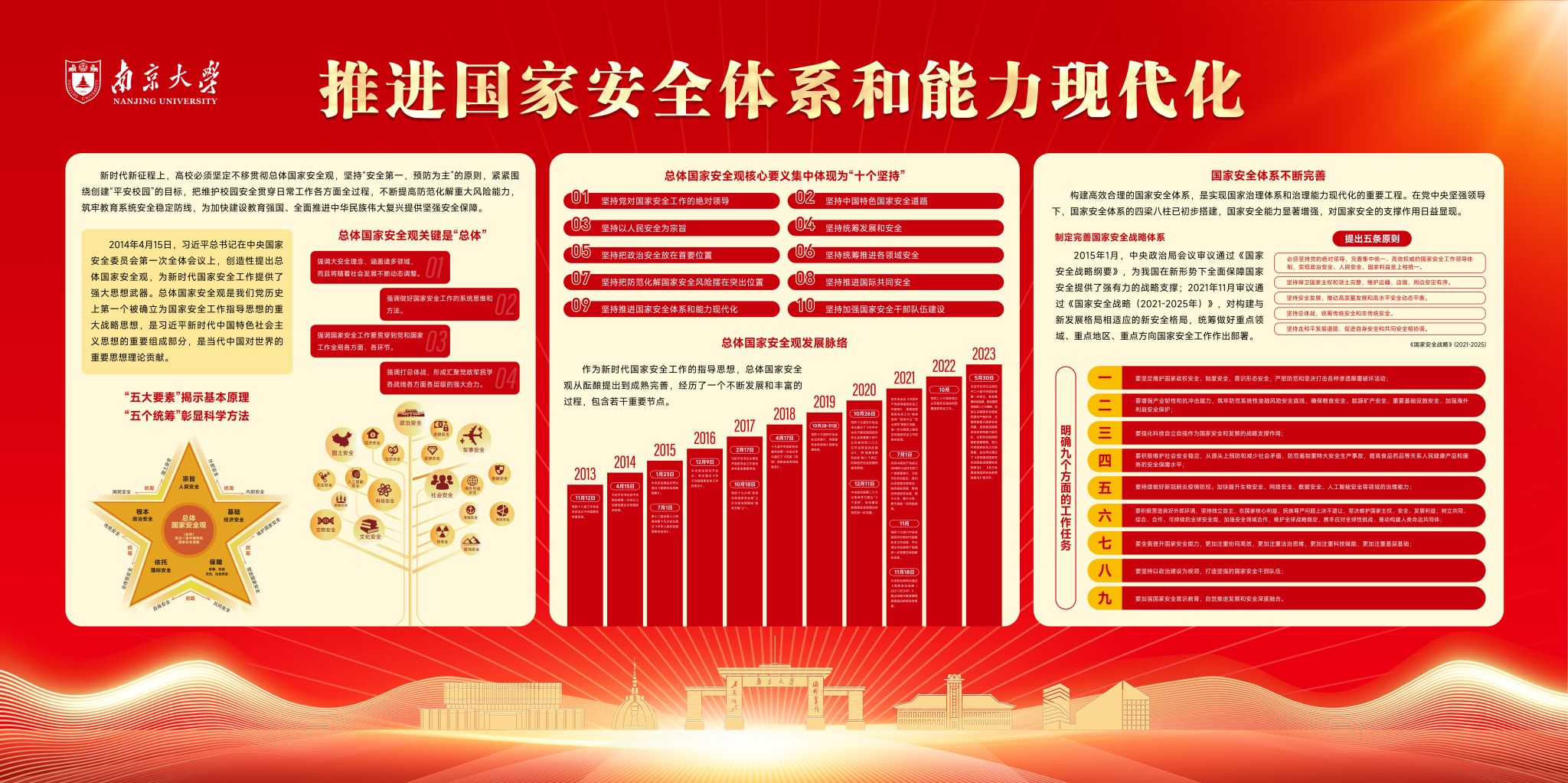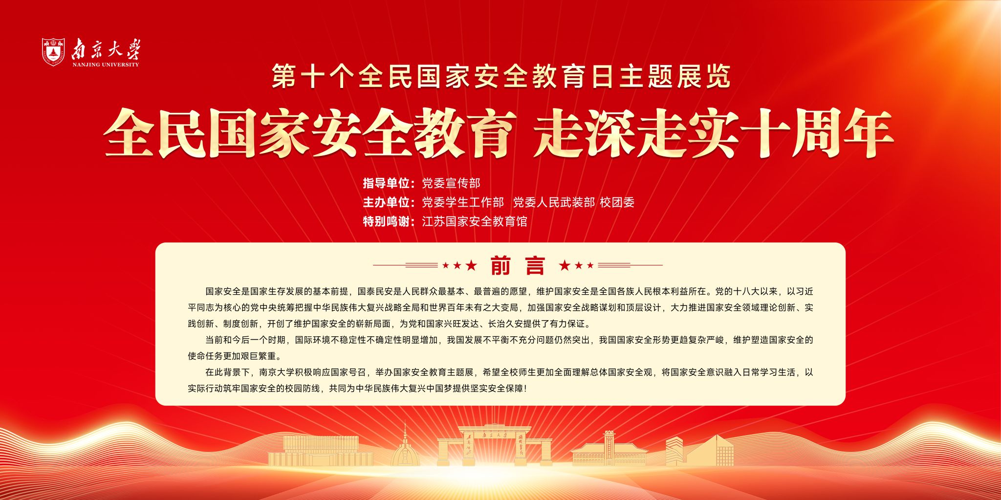 4月15日,学校在仙林校区、鼓楼校区、苏州校区学生社区举办全民国家安全教育主题展。该展览以“全民国家安全教育 走深走实十周年”为主题,展示了总体国家安全观的理论内涵与实践成果,通过时代楷模、先进典型等阐述了国家安全涵盖的政治、国土、军事、经济、科技、文化、社会、生态等多个领域,以及生物、太空、深海、极地等不断拓展的新型领域安全。特别是通过梁成运案、彼得案、李亨利案、肃某案等27个危害国家安全典型案例强调了我国国家安全面临的严峻挑战。