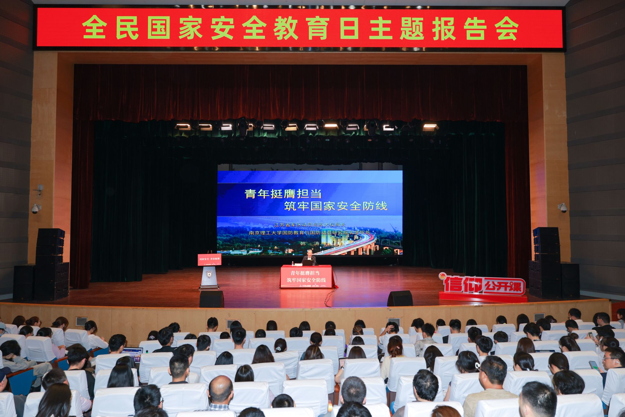 4月11日,学校举办全民国家安全教育日主题报告会。江苏省军区动员局原大校局长韩涛以“青年挺膺担当,筑牢国家安全防线”为题,从总体国家安全观的重大意义、我国国家安全领域面临的风险挑战、青年学生如何践行总体国家安全观三个方面展开,阐述了高校师生在筑牢国家安全防线中的责任和使命。韩涛强调,当代青年要做国家安全的“清醒者”,在社交媒体发言前多问一句“是否利于国家安全”;做“行动派”,严守实验室数据管理、论文发布审查等科研安全底线;做“破局者”,在芯片、量子、生物等关键领域勇攀科技高峰。“青马工程”研修班学员、外国语学院2021级本科生王馨媛表示,她将主动学习国家安全知识,提升对相关问题的敏锐性和判断力,自觉维护网络空间的清朗环境,与更多的同学筑牢国家和校园“安全网”。电子科学与工程学院2024级硕士研究生张子睿表示,他将以科技报国为使命,在科研全链条构建安全防线,将个人追求融入国家安全伟业,在专精特新领域持续突破关键技术壁垒。